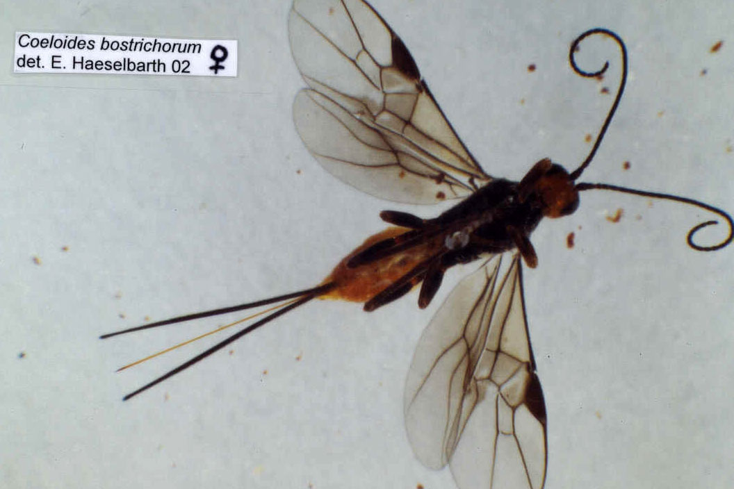 Typisch für das Weibchen des wichtigen und häufigsten Borkenkäferparasitoiden Coeloides bostrichorum ist der lange Legestachel und der gelb gefärbte Hinterleib. Männchen und Weibchen können erheblich in der Größe variieren, auch die Hinterleibfärbung reicht von kräftig gelb bis schwärzlich. Die nicht so häufig festgestellten Brackwespenarten Rhopalophorus clavicornis und Dendrosoter middendorffi sind viel unscheinbarer. Abbildung 3 zeigt ein Weibchen von Coeloides bostrichorum in der typischen gelben Farbe.