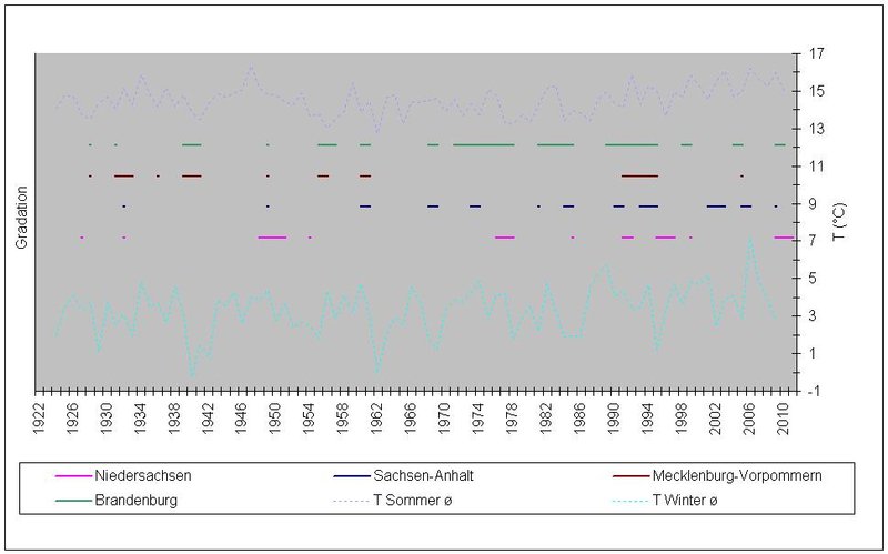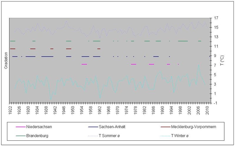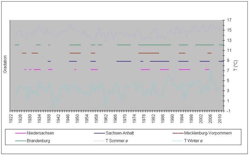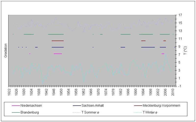 Bis Ende der 1960er Jahre verlaufen die Gradationen in Brandenburg, Sachsen-Anhalt und Mecklenburg-Vorpommern relativ synchron, so dass sich für diese Bundesländer ein regelmäßiges Gradationsmuster ergibt, von welchem nur Niedersachsen abweicht (Abb. 5).