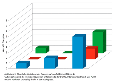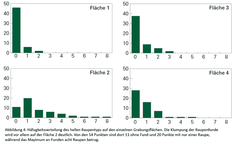Überraschend war, dass auf der Fläche 4 bei einer oberirdischen Beurteilung keine Schäden ersichtlich waren, hier aber mit 42 Raupen die zweithöchste Anzahl gefunden wurde. Die hohe Zahl scheint im Widerspruch zu dem geringen Schadensausmaß zu stehen. Grund dafür könnte sein, dass die Dichte, welche zu größeren Schäden führt, auf dieser Fläche noch nicht erreicht wurde. Da die Grabungen aber nur eine Momentaufnahme darstellen und bisher noch keine Daten über den Massenwechsel der Arten vorliegen, können nur weitere Untersuchungen Aufschluss geben.