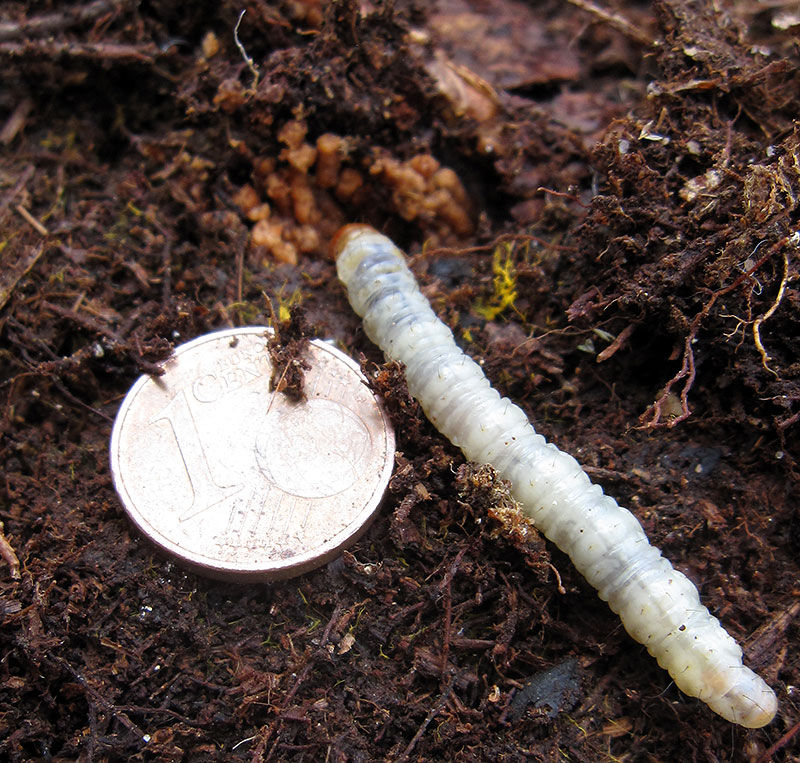 Die Raupen sind weißlich durchscheinend. Insgesamt wurden 197 Stück bei den Probegrabungen gefunden. 19 davon hatten einen dunklen Kopf sowie eine dunkle Oberseite der ersten drei Brustsegmente. Diese Raupen waren 30 bis 40 Millimeter lang und ungefähr drei Millimeter dick. Es waren Raupen des Heidekraut-Wurzelbohrers (Phymatopus hecta).