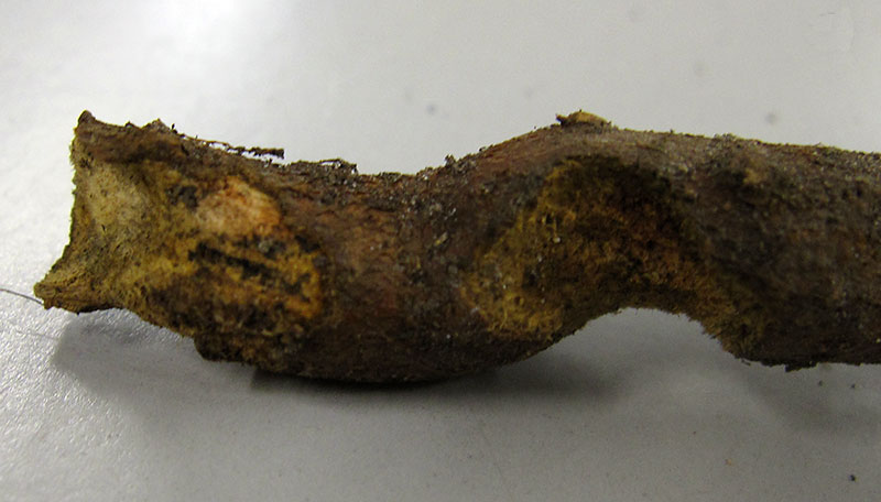 Bei den abgestorbenen Buchen waren die Wurzeln in fünf bis zehn Zentimetern Tiefe, bei den Heidelbeeren ebenfalls in etwa zehn Zentimetern Tiefe komplett abgetrennt. Zusätzlich wurden an den Wurzeln knapp unterhalb der Oberfläche unregelmäßig ausgeformte Verletzungen gefunden (Abb. 1). Hier war zum Teil mehr als der halbe Wurzeldurchmesser abgefressen, kurz unterhalb der Wurzeloberfläche fanden sich teilweise in Längsrichtung verlaufende, etwa fünf Millimeter breite Fraßgänge.