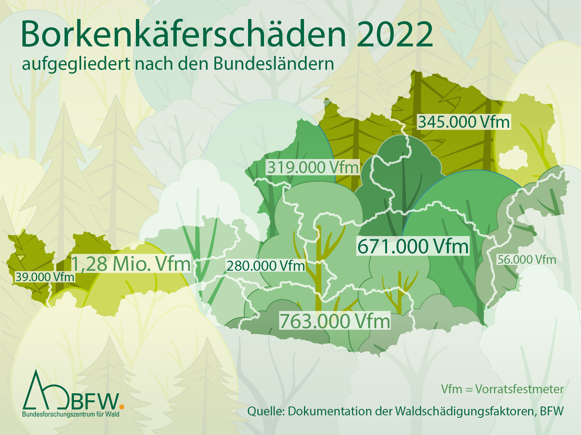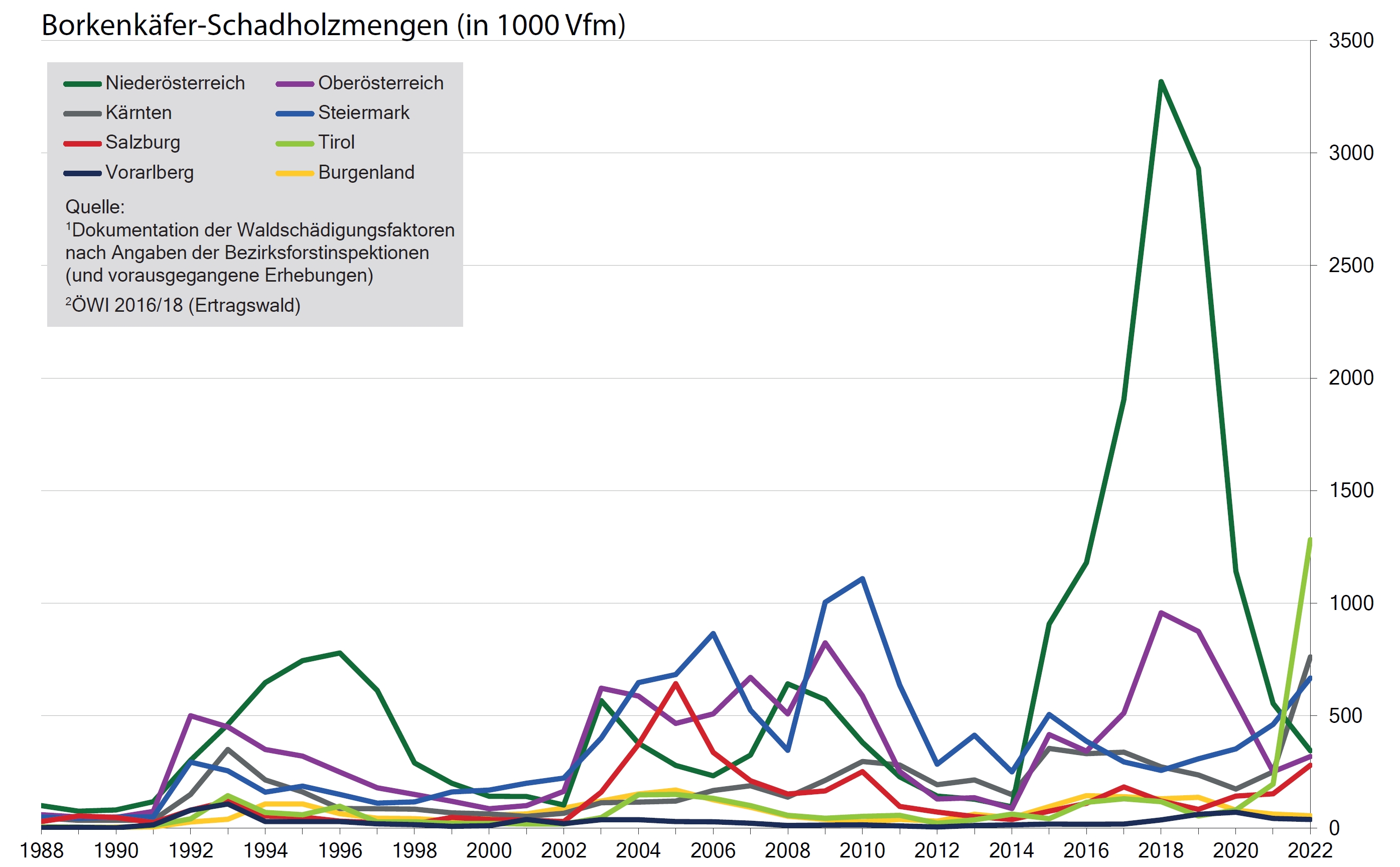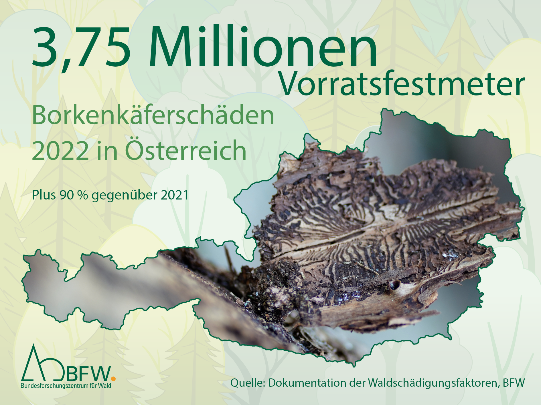 Laut Dokumentation der Waldschädigungsfaktoren (DWF) betrugen 2022 die Borkenkäferschäden 3,75 Millionen Vorratsfestmeter (plus 90 % gegenüber dem Vorjahr), der dritthöchste je in Österreich erfasste Wert. Der Schadensschwerpunkt lag südlich des Alpenhauptkammes: Das stärkste Plus, die sechsfache Menge gegenüber dem Vorjahr, gab es neuerlich in Tirol (1,28 Millionen Vorratsfestmeter), wobei der allergrößte Teil der Schäden in Osttirol anfiel. Im Bezirk Lienz betrug die Schadholzmenge sogar das Zehnfache (1,13 Millionen Vorratsfestmeter). In Kärnten verdoppelte sich die Käferholzmenge auf 760.000 Vorratsfestmeter, das Zentrum war der Bezirk Spittal an der Drau mit einer Versechsfachung der Schäden (400.000 Vorratsfestmeter).