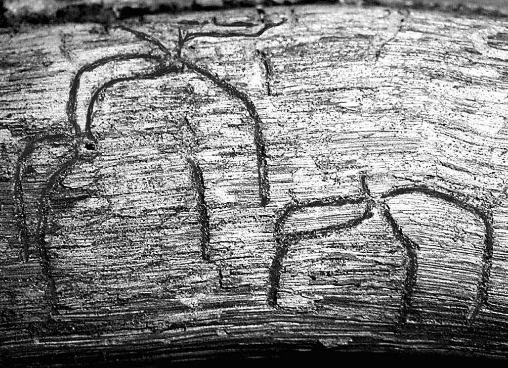 Am Brutbild lassen sich die astbesiedelnden Eichenborkenkäfer gut unterscheiden. Die pilzzüchtenden Arten der Gattung Xyleborus und Cyclorhipidion legen ihr Brutsystem im Holz an. Der Eichensplintkäfer (Scolytus intricatus) ist an den tief in den Splint eingreifenden und in Faserrichtung verlaufenden Gangsystemen und Puppenwiegen kenntlich. Das charakteristische Fraßbild des rindenbrütenden Kleinen Eichenborkenkäfers ist bei starkem Befall ungeordnet, meist zeigen sich jedoch Gänge in Sternform. Sie liegen überwiegend im Bast, der Splint wird nur oberflächlich geschürft.