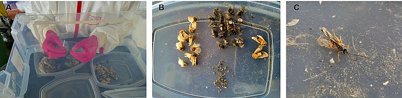 Abb. 2: A) Untersuchung der Gespinstnester und B) Sortierung der Funde nach der natürlichen Flugperiode. C) Geschlüpfte parasitierende Schlupfwespe. Fotos: W. Theisinger und O. Theisinger