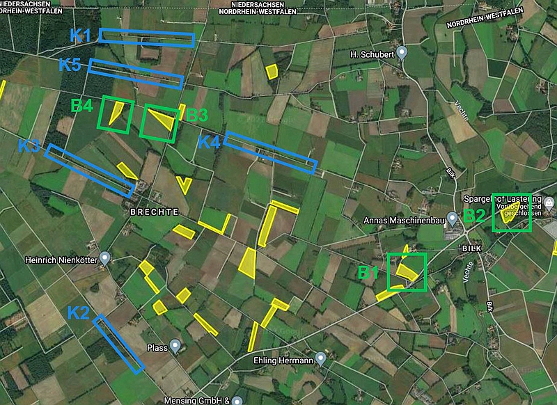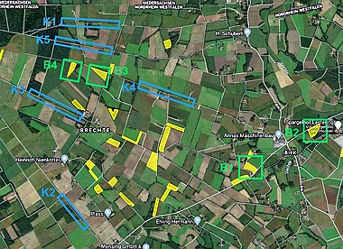 Blühende Waldränder stellen normalerweise einen idealen Lebensraum für Insekten dar. Wenn die Anlage von Waldrändern allerdings nicht möglich ist, können Ackerrandbegrünungen bzw. Blühflächen auf landwirtschaftlichen Flächen, die an Eichenbestände und Eichenalleen angrenzen, als Lebensräume für diese Gegenspieler dienen (Abb. 1). Das Projekt "Blühmasse" des Vereins "Nachhaltiger Westen e.V." im Münsterland fördert die Anlage solcher Blühflächen zur Biogasgewinnung, als Alternative zum Maisanbau. Das Team Wald- und Klimaschutz hat dort mit der Unterstützung des Vereins eine Untersuchung der Schlupfrate von EPS-Faltern durchgeführt, um herauszufinden, ob sich Blühflächen als Bekämpfungs- bzw. Präventivmaßnahme gegen den EPS eignen. Dafür wurden Gespinstnester an Blüh- und Kontrollflächen eingesammelt und auf die Anzahl der geschlüpften Falter und Gegenspieler hin untersucht (Abb. 2).