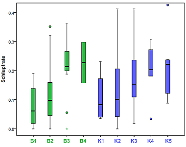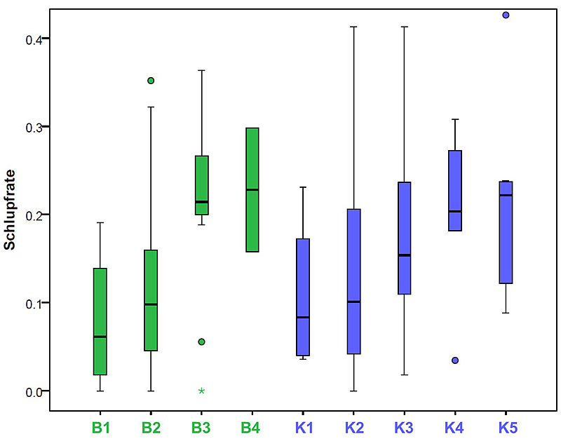 Unsere Untersuchung hat erwartungsgemäß gezeigt, dass die Anlage von Blühflächen nicht sofort zu einer höheren Parasitierungsrate beim EPS führt. Allerdings wurde an Blühflächen, deren Aussaat drei Jahre zurückliegt (B1 und B2, Abb. 3), eine niedrigere Schlupfrate, bzw. eine höhere Parasitierungsrate festgestellt als an zweijährigen Flächen. Ähnliches gilt für Nester an Eichen, die sich zwar nicht an einer angelegten Blühfläche befanden, wo aber ein höheres Angebot an Blühpflanzen durch die Begleitvegetation (Sträucher) vorhanden war (K1 und K2, Abb. 3).