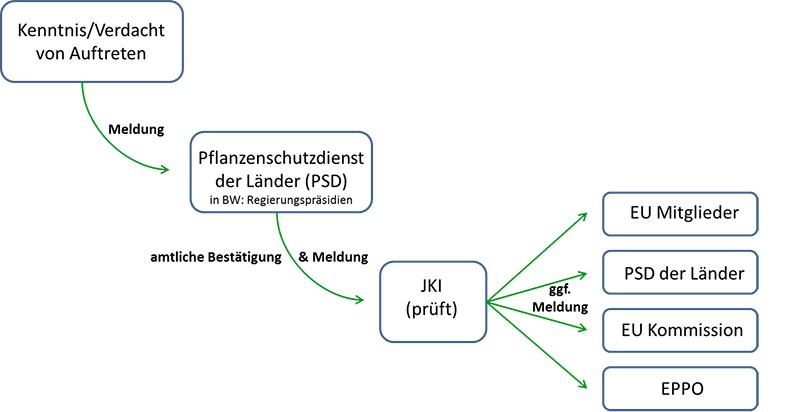 Die Behörde überprüft und bestätigt ggf. den Befund und macht dann Meldung an das Julius-Kühn-Institut als zuständige Bundesbehörde im Fachbereich des Bundesministeriums für Ernährung und Landwirtschaft (BMEL). Bestätigt sich der Verdacht, gibt das JKI eine Meldung an die anderen EU-Mitgliedstaaten, die Pflanzenschutzdienste der Bundesländer, die EU-Kommission und die EPPO heraus [3], (Abb. 1).