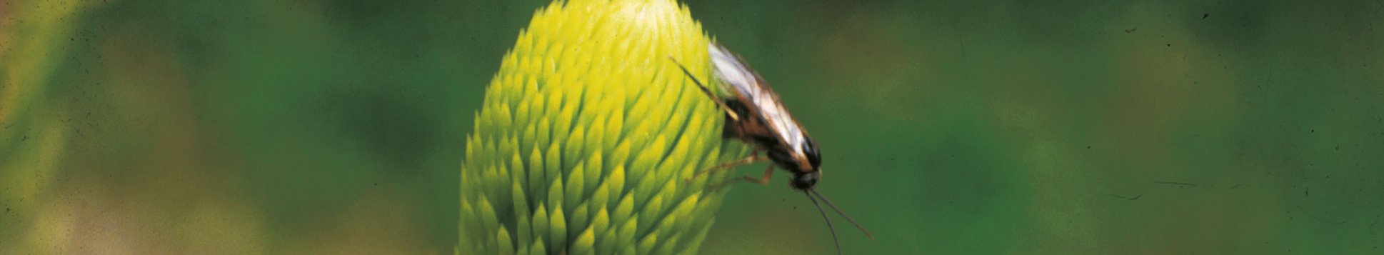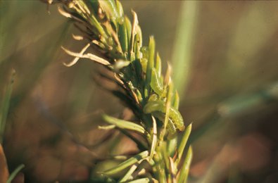 Abb. 1: Die Kleine Fichtenblattwespe bei der Eiablage (links), und ihre Larven (rechts)(Fotos: LWF).