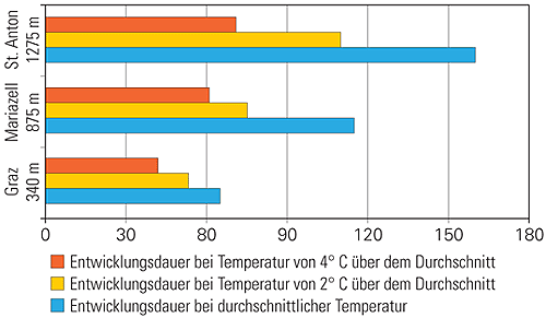 Erhöht sich die Temperatur um 4 °C, benötigt der Fichtenborkenkäfer in 1275 m Seehöhe nur mehr die halbe Zeit je Generation (Abbildung 2).