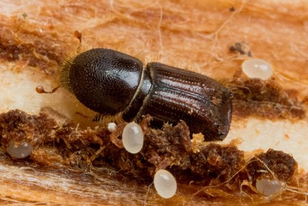 Buchdrucker schaffen es aber auch aus eigener Kraft, sich durch die Folie zu bohren. Gleiches gilt für Mäuse. Ein vollständig besiedelter, klassischer Fixlängen-Polter (80 Stämme, BHD 30 cm, 5m lang) kann bis zu 14 Liter Buchdrucker beinhalten. Das entspricht mehr als 500.000 Käfern. Also selbst wenn man ein paar Hand voll toter Käfer unter der Folie finden würde, ändert das angesichts dieser großen Anzahl von Käfern nichts an der Einschätzung einer ungenügenden Waldschutzwirksamkeit.