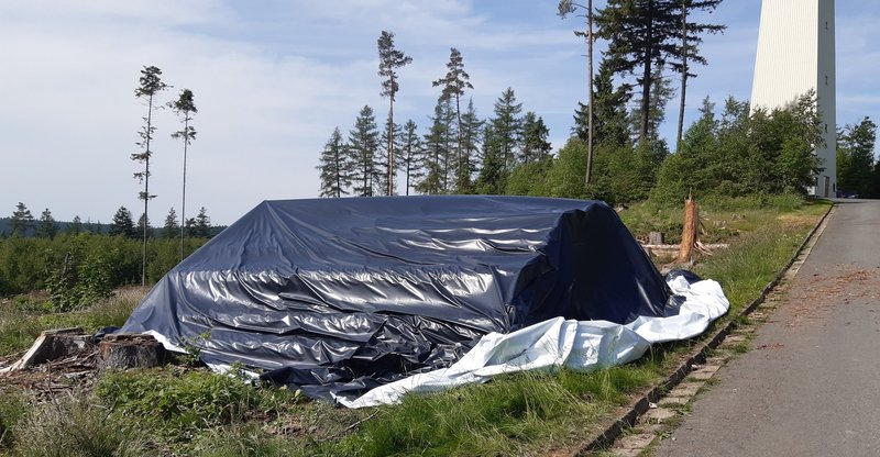 Wie ist die Hackung von befallenem Material aus Waldschutzsicht zu beurteilen, wenn das Hackgut im Wald verbleiben soll? Bei einer Untersuchungen der Forstlichen Versuchsanstalt (FVA) in Freiburg wurde von Buchdrucker und Kupferstecher befallenes Fichten-Stammholz Mitte August gehackt und auf mehreren Haufen aufgeschüttet und mit Folie abgedeckt. An zwei Stellen wurde es flächig verblasen.