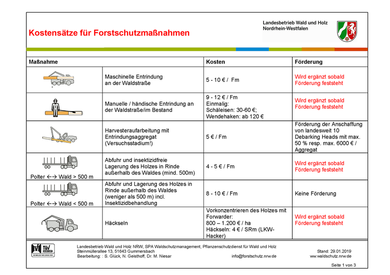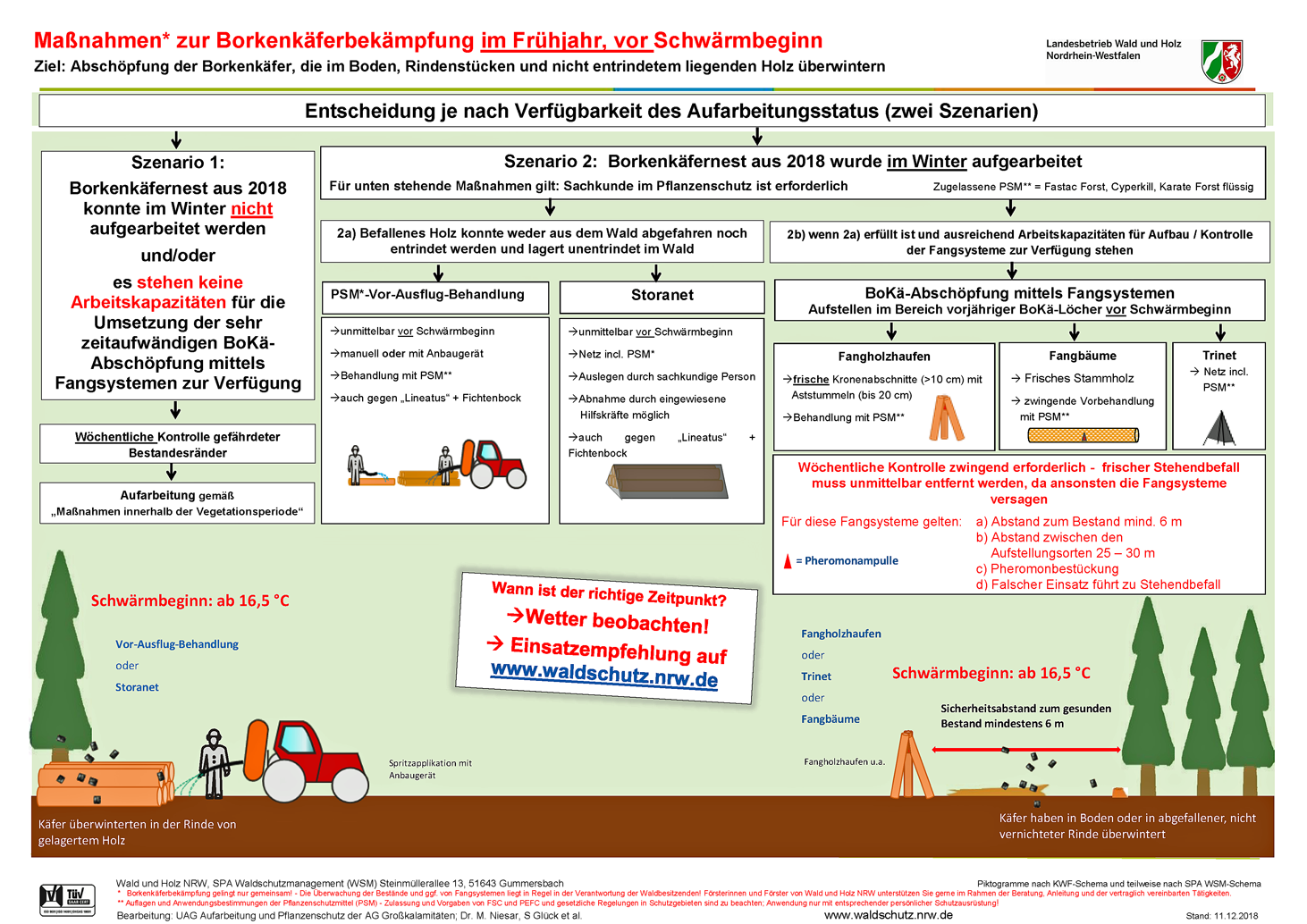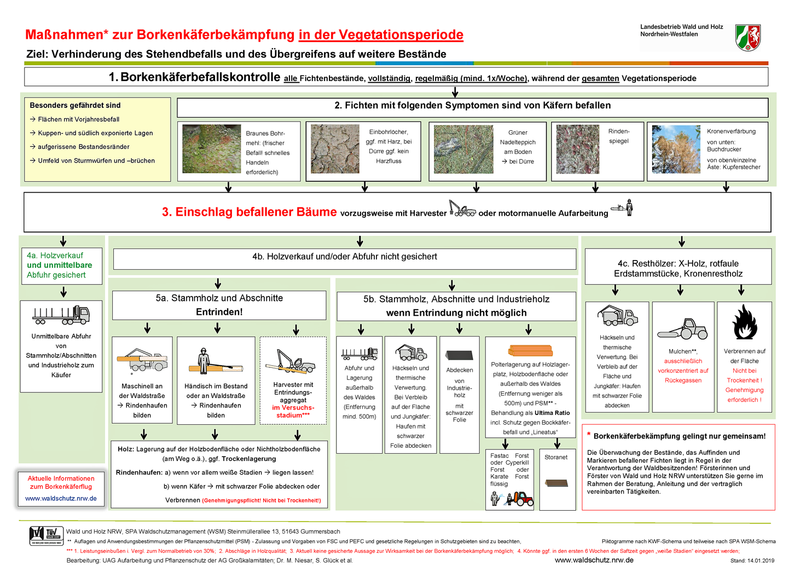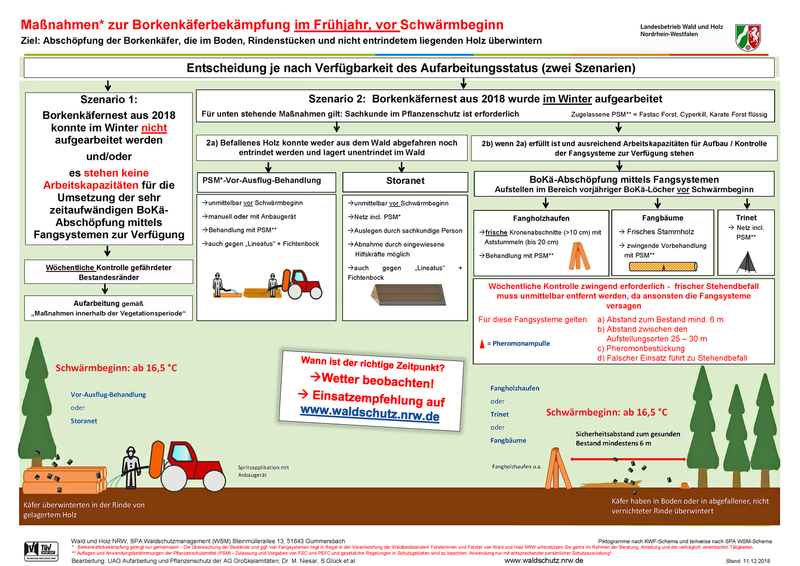 Aktuelle Untersuchungen in Nordrhein-Westfalen zeigen weiterhin hohe Borkenkäferdichten in der Rinde stehender Fichten. Die Fortsetzung der Aufarbeitung nach dem Maßnahmenschema "Spätherbst und Winter" wird daher dringend empfohlen. Vornehmlich stellt sich die Frage: "Wie weit bin ich?"