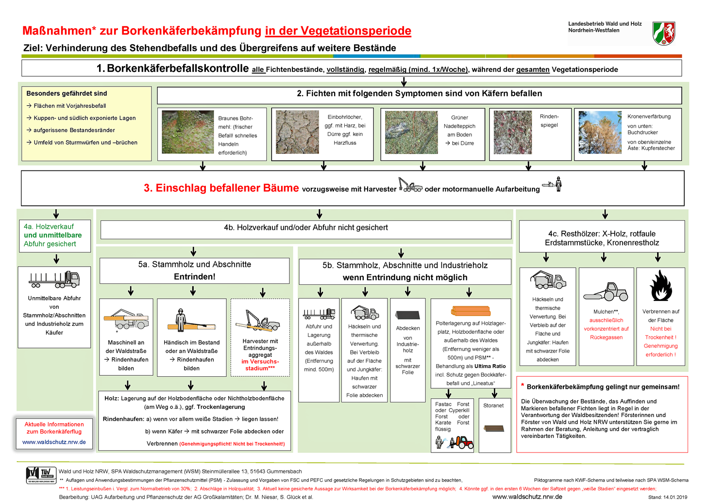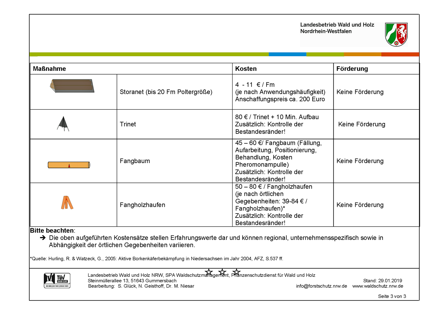 - Während der Vegetationsperiode können an Poltern und an liegendem Holz in den Beständen Pflanzenschutzmittel (PSM-Spritzapplikation oder Storanet) sowohl gegen Borkenkäfer als auch gegen bestimmte holzbrütende Käferarten eingesetzt werden. Hierbei sind die Auflagen und Anwendungsbestimmungen der Pflanzenschutzmittel (PSM) - Zulassung und Vorgaben von FSC und PEFC und gesetzliche Regelungen in Schutzgebieten - zu beachten.