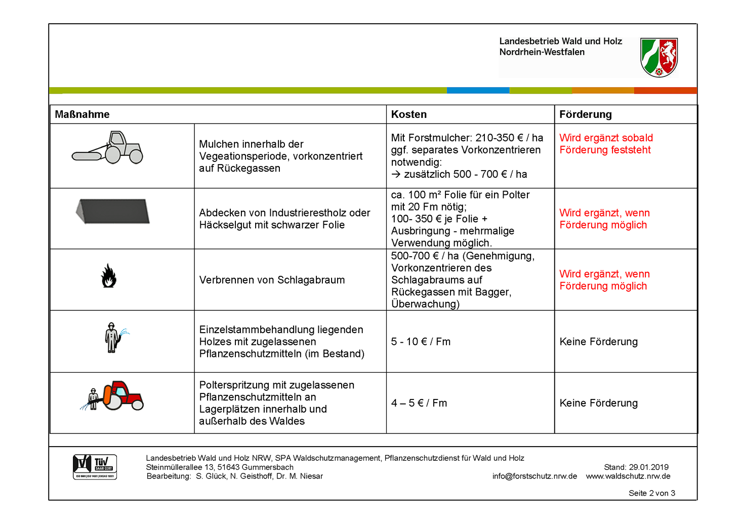In der Regel werden die Polter auf Grünland-/Weideflächen angelegt. In Absprache mit dem Pflanzenschutzdienst der Landwirtschaftskammer NRW ist dann gegen einen Insektizideinsatz nichts einzuwenden und auch keine Genehmigung nach §22 Pflanzenschutzgesetz erforderlich, wenn