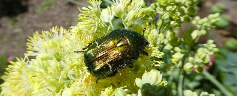 Abb. 3: Der Rosenkäfer wird wegen seiner außergewöhnlich grün-metallischen Färbung der Flügeldecken gern der "fliegende Smaragd" genannt. Und tatsächlich ist der grün-goldene Brummer im Fluge weder zu übersehen noch zu überhören und die Assoziation mit einem fliegenden Edelstein liegt sehr nahe