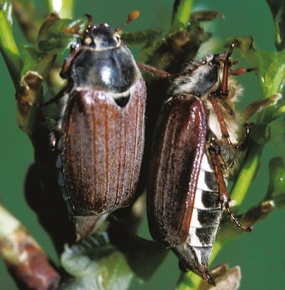 Maikäfer gehören zu den Blatthornkäfern (Scarabaeidae). Im Wesentlichen spielen bei uns in Deutschland nur zwei Maikäferarten eine Rolle. Der häufigste ist der Feldmaikäfer (Melolontha melolontha). Im Norden und Osten Europas sowie in Deutschland gesellt sich vornehmlich auf sandigen Böden noch der Waldmaikäfer (Melolontha hippocastani) hinzu. Beide Arten sind sich äußerlich sehr ähnlich und nur Experten können sie sicher voneinander unterscheiden. Die Käfer sind 20-30 mm lang und dunkelbraun. Trotz des Namens beginnen die Maikäfer je nach Witterung und Region ab Mitte April zu fliegen und können auch im Juni noch unterwegs sein.