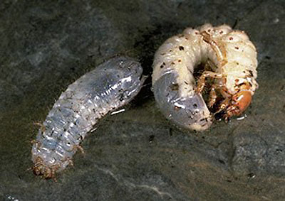Abb. 3: Engerlinge im Vergleich, Rosenkäfer (links) und Maikäfer (rechts). Deutlich sind die viel stärkeren Beine des Maikäfer-Engerlings mit den gelenkförmigen "Knicken" zu sehen. Im Gegensatz dazu der Rosenkäfer-Engerling mit seinen vergleichsweise schwachen Beinchen (Foto: B. Fecker, WSL).
