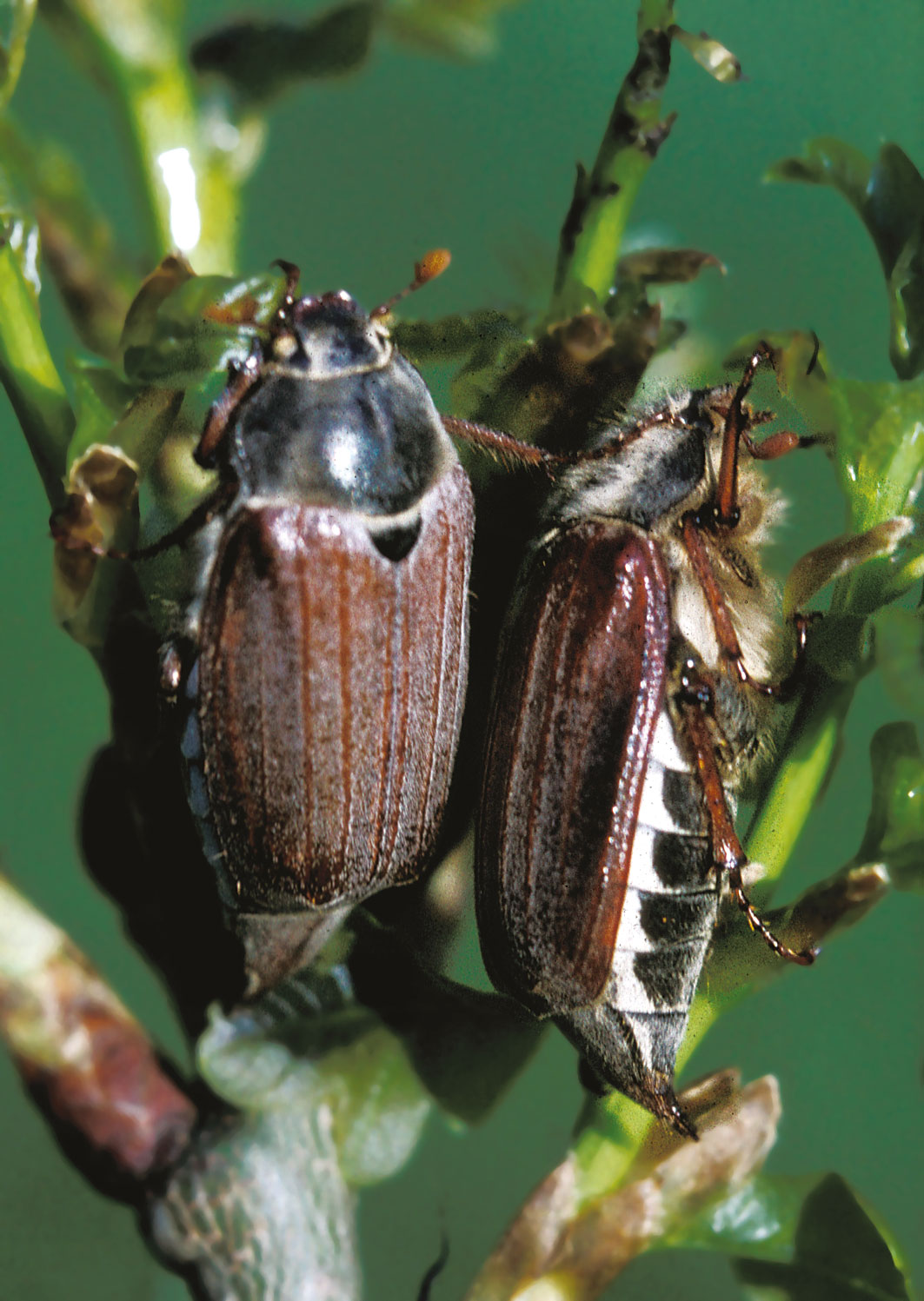 Häufig werden die Maikäfer mit Junikäfern und dem Gartenlaubkäfer (Phyllopertha horticola) verwechselt, die allesamt ebenfalls zu den Blatthornkäfern zählen (Abb. 2). Bei den Junikäfern handelt es sich um mehrere Arten der Gattungen Amphimallon und Rhizotrogus, wobei man in Deutschland am ehesten auf Amphimallon solstitiale treffen wird.