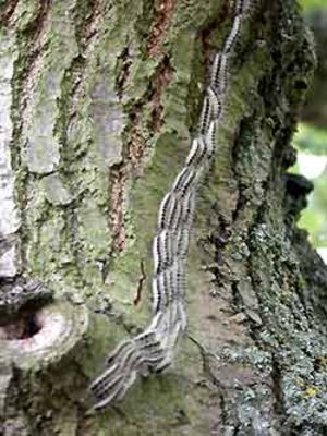 Der Eichenprozessionsspinner(Thaumetopoea processionea L.) (Abb. 2) breitet sich seit 2004 in Baden-Württemberg in bisher nicht bekannter Weise aus. Es sind weniger die Fraßschäden der Raupen als vielmehr die gesundheitlichen Beeinträchtigungen für den Menschen, die zu Abwehrmaßnahmen zwingen. Ab dem dritten Larvenstadium verfügen die Raupen über Brennhaare, die bei Hautkontakt Reaktionen auslösen können, welche von juckenden Pusteln bis zu allergischen Schockreaktionen reichen.
