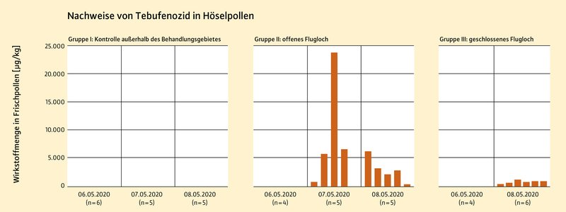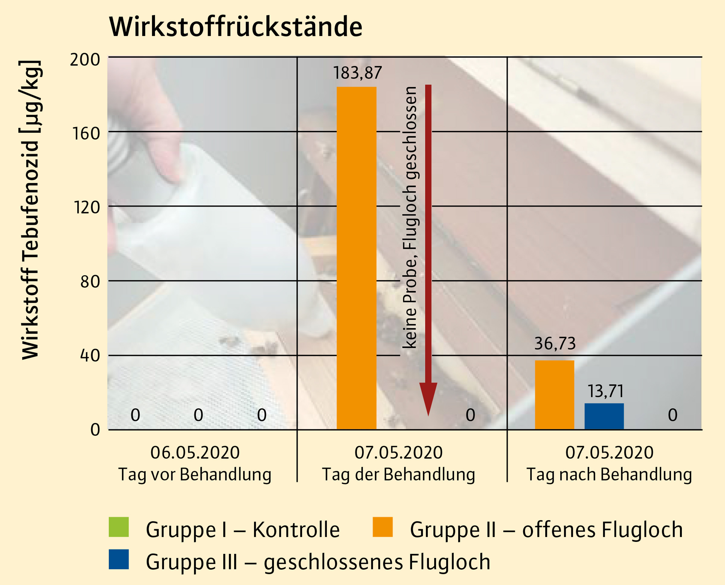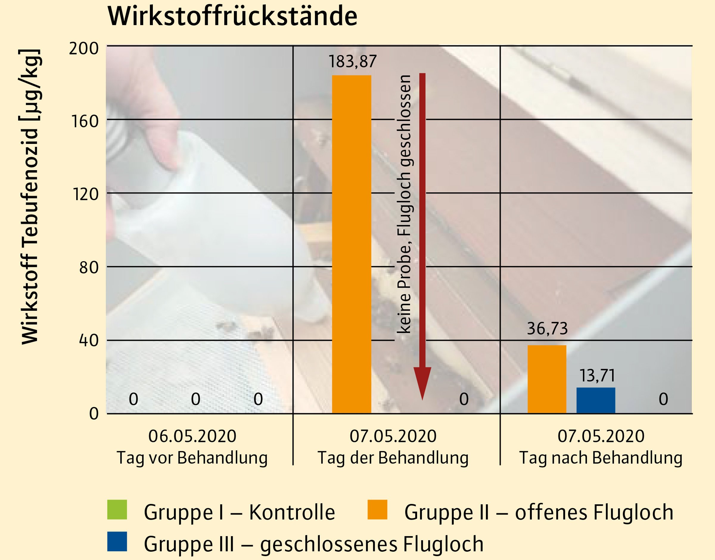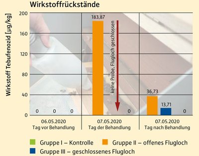 Auch bei den Bienenvölkern, die am Behandlungstag verschlossen waren, fanden sich am Folgetag Rückstände in Sammlerinnen (knapp 14 µg/kg) und im Pollen (407–1.232 µg/kg). Im Honig, der im Anschluss an den Versuch von den Bienenvölkern geerntet wurde, konnte der Wirkstoff nicht nachgewiesen werden.