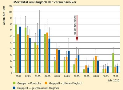 Es konnten keine Unterschiede in der Entwicklung der Bienenvölker und in der Mortalität zwischen den drei Gruppen beobachtet werden. Die Populationsschätzung am Ende des Versuches ergab für alle drei Gruppen einen leichten Anstieg bei der Anzahl der Bienen (27.800) und Brutzellen (43.700) – dieser entspricht aber der natürlichen Entwicklung der Völker im Mai. Die Mortalität am Flugloch schwankte zwischen den Tagen deutlich stärker als zwischen den Gruppen (Abbildung 6).