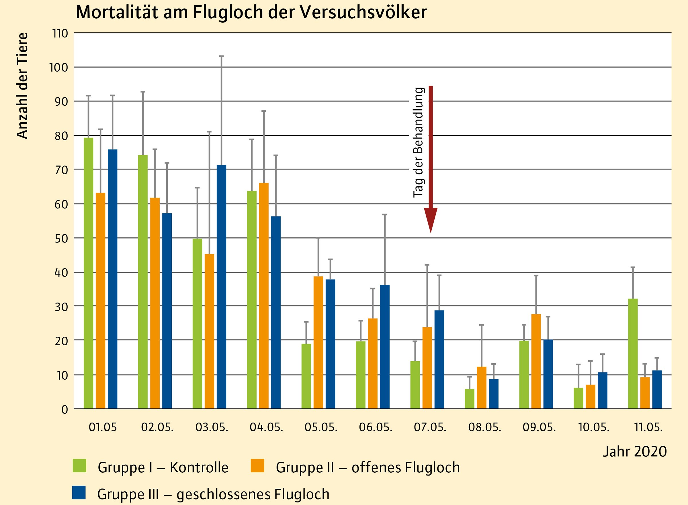 - Gruppe III: Versuchsstandort im Behandlungsgebiet mit geschlossenem Flugloch am Tag der Behandlung