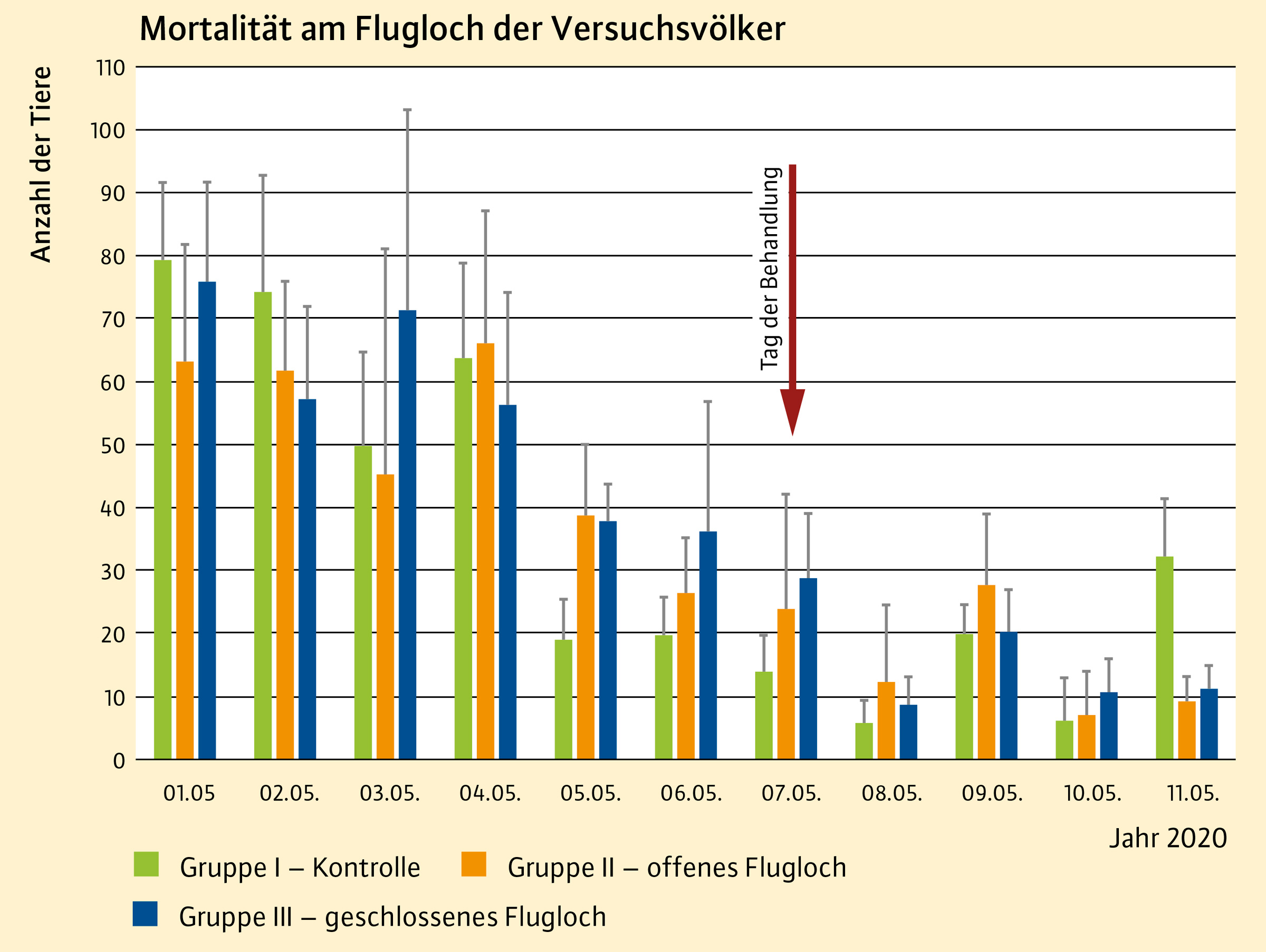 - Gruppe II: Versuchsstandort im Behandlungsgebiet mit offenem Flugloch am Tag der Behandlung
