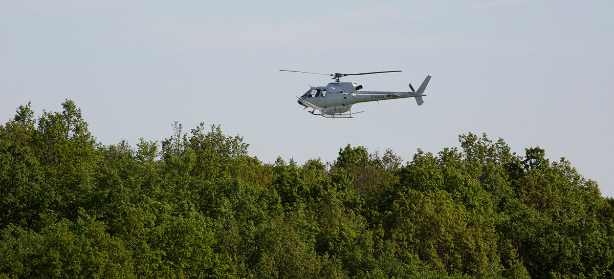 Für die Pflanzenschutzmittelbehandlung wählte das Waldschutz-Team der LWF MIMIC® mit dem Wirkstoff Tebufenozid aus, weil es unter den zur Verfügung stehenden PSM-Präparaten ihrer Einschätzung nach das beste Verhältnis von Wirksamkeit, Wirkungsdauer und geringen Nebenwirkungen auf Nichtzielorganismen aufwies. Tebufenozid wirkt als Häutungsbeschleuniger selektiv auf Schmetterlingslarven. Es bewirkt einen Fraßstopp, eine Beschleunigung der Häutungen und nach fünf bis sieben Tagen das Absterben der Raupen. Die Ausbringung von MIMIC® auf den ausgewählten rund 2.780 ha erfolgte mittels Hubschrauber (750 ml/ha in 50 l/ ha Wasser) im Mai 2020.