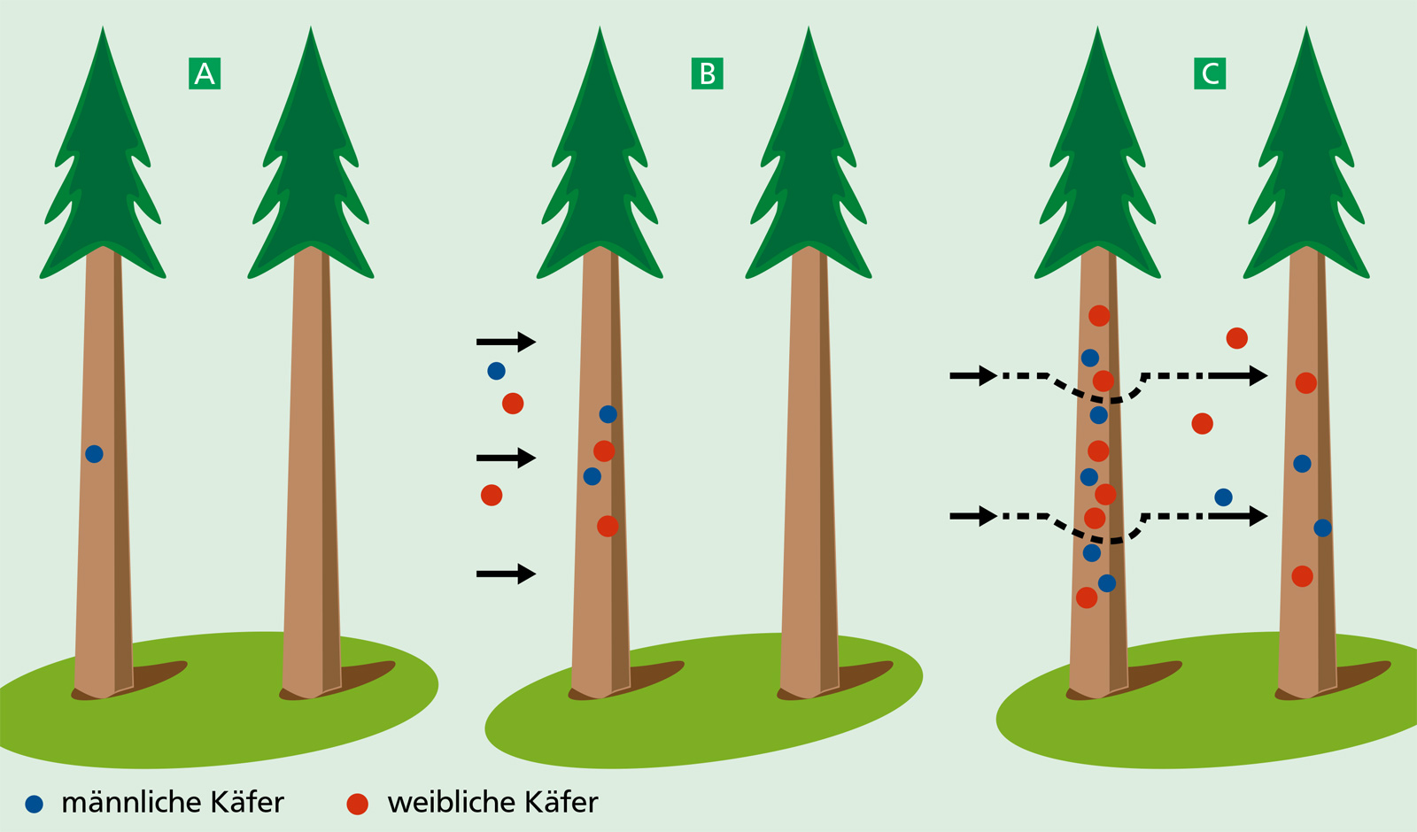Das Prinzip der Befallsverhinderung durch Ablenkstoffe beruht auf dem natürlichen Befallsgeschehen der Fichtenborkenkäfer. Im Frühjahr zum Schwärmflug fliegen die Borkenkäfer auf der Suche nach Brutmaterial ungezielt durch die Wälder. Bei erfolgreichem Befall einer Fichte (A) geben die Käfer einen Duftstoff ab, der weitere Borkenkäfer anlockt – der Duftstoff bedeutet: "Hier ist gutes Brutmaterial" (B). Bei fortschreitendem Befall geben die bereits eingebohrten Käfer einen weiteren Duftstoff ab, der bedeutet: "Hier ist besetzt, geht woanders hin" (C).