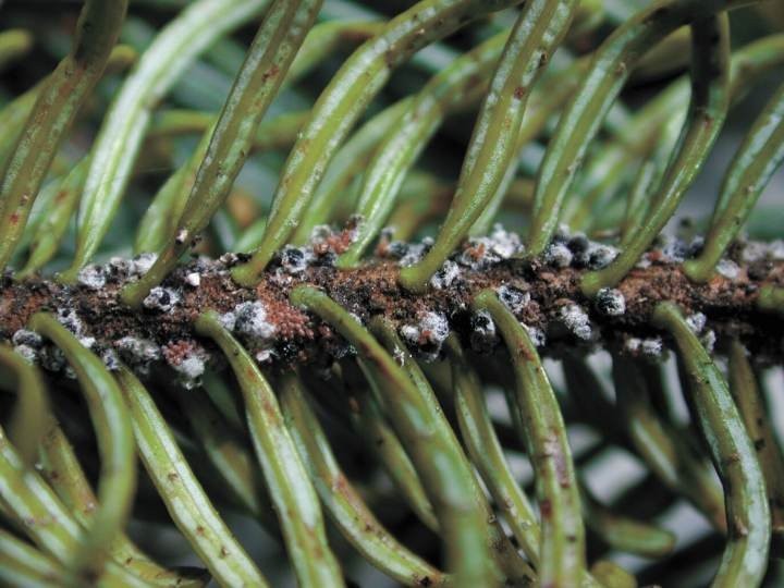 Abb. 2: Überwinterte Tannentriebläuse mit schützender, weißer Wachswolle. Fotos: Bernhard Perny/ BFW
