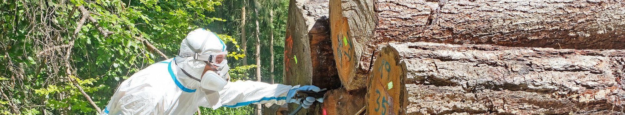 - Bei maschinellem Entrinden von insektizidbehandelten Stämmen vor Ablauf der insektiziden Wirkung unter Bedingungen, die zur Staubentwicklung führen, geeignete Schutzvorkehrungen treffen (z.B. Arbeit in geschlossener Kabine oder Körperschutzmaßnahmen analog zur Ausbringung des Mittels).