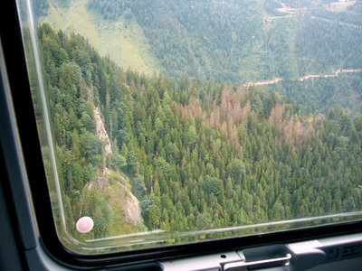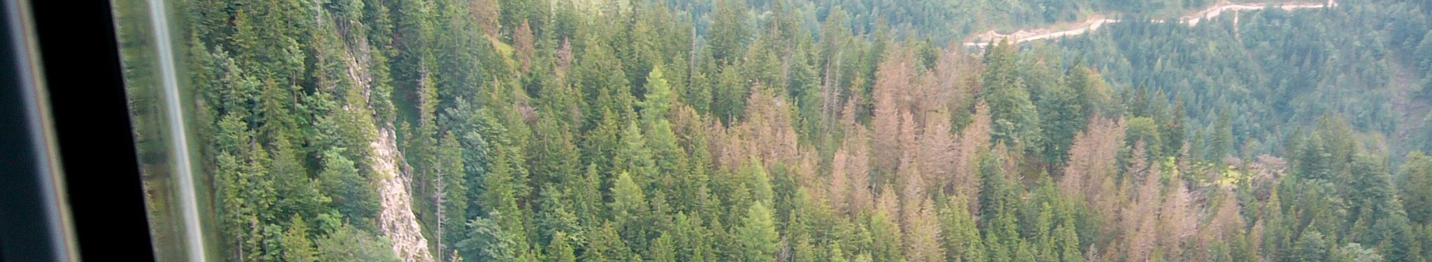 Viele Bestände in den oberbayerischen Alpen waren als Folge des trockenen Sommers 2003 durchzogen mit einzelnen absterbenden Fichten. Besonders in schlecht zugänglichen Lagen war es vielfach nicht möglich, den nachfolgenden Borkenkäferbefall zu entdecken - flächiges Suchen nach Bohrmehl oder nach grünen Nadeln am Boden scheidet in diesen Lagen aus.