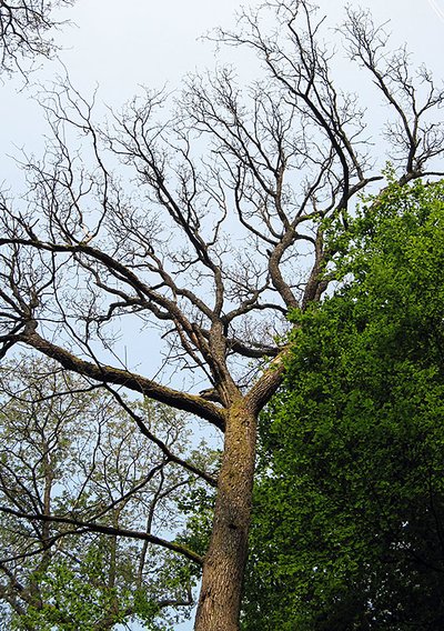 Handlungsempfehlungen: Nach Massenvermehrung blattfressender Insekten kann der Zweipunkt-Eichenprachtkäfer Bäume zum Absterben bringen (Abb. 7 und 8), die sich sonst möglicherweise wieder regeneriert hätten. Phytosanitär sinnvoll ist nur der Einschlag von Bäumen mit aktuellem Befall. Ist der Käfer aus den abgestorbenen Bäumen bereits ausgeflogen, können diese im Bestand verbleiben und zur Totholzmehrung beitragen. Akut befallene Bäume stehenzulassen verbietet sich allerdings. Solche Bestände sind in Jahren der Massenvermehrung des Eichenprachtkäfers für eine gezielte Totholzanreicherung ungeeignet.
