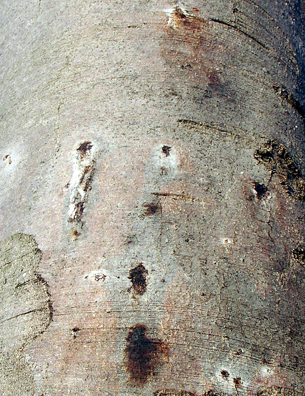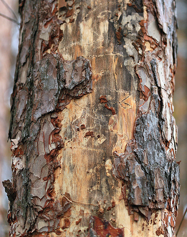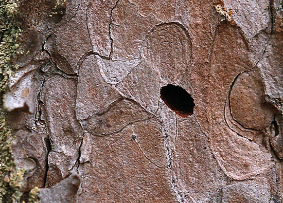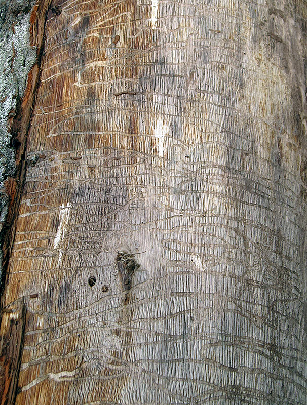 Befall erkennen: Der Befall wird meist ab September durch Spechtabschläge der Rinde erkennbar. Man kann dann die Fraßgänge (Abb. 5) der kochlöffelförmigen Larven mit dem wolkenartig angeordneten Bohrmehl sehen. Die schmal ovalen Ausfluglöcher der Käfer sind oft schräg gestellt (Abb. 6). Ein unsicheres Merkmal für Prachtkäferbefall ist eine Braunfärbung der Kiefernkrone. Diese kann auch durch andere Schadorganismen oder Trockenheit verursacht sein.