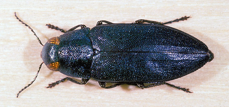 Unter dem Begriff "Blauer Kiefernprachtkäfer" werden häufig die beiden Arten Phaenops cyanea (Abb. 4) und Phaenops formaneki zusammengefasst. Wirtsbaumart ist die Kiefer, befallen werden geschwächte Stangen- und Baumhölzer. Beide Arten können keine gesunden Kiefern befallen. Die Larven von Phaenops cyanea entwickeln sich unter der dickborkigen Kiefernrinde, die von Phaenops formaneki unter der Spiegelrinde; der Splint wird nicht oder nur sehr schwach geschürft. Die Käfer fliegen von Juni bis September.