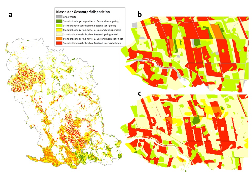 - Durch die Option einer einfachen Integration weiterer Bewertungskriterien bzw. der Neugewichtung bereits Vorhandener soll es möglich sein, schnell neue Erkenntnisse hinsichtlich der Prädiktoren der Befallsdynamik bzw. deren Einflusses auf die Prädisposition im Modell abzubilden.