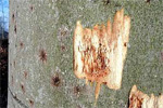 Abb. 4: Schleimflussflecken um Einbohrlöcher des Prachtkäfers.