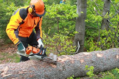 Abb. 1. Bei dem Rindenstreifen (hier maschinell) von sturmgrfällten Fichten sollte darauf geachtet werden, dass das Phloem vollständig durchtrennt wird und keine flächiges Rindenstücke merh am Stamm übrig bleiben. Foto: Simon Thorn