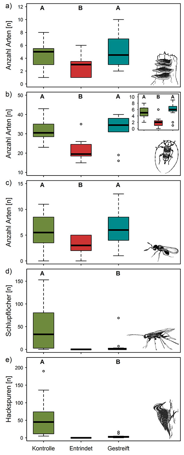 Abb. 2. Entrindung von Fichtenstämmen verursachte einen massiven Kollateralschaden bei totholzbewohnenden Arten, wie Holzpilzen (a), Totholzkäfern (b und Arten der roten Liste) und parasitoiden Wespen (c). In Stämmen mit gestreifter Rinde konnte jedoch eine ähnlich hohe Artenzahl gefunden werden, wie in unbehandelten Kontrollstämmen. Allerdings reduzierte sowohl ein vollständiges Entrinden als auch Rindenstreifen die Anzahl ausschlüpfender Riesenholzwespen (d) und die Anzahl an Spechthackspuren (e), ein Maß für die Nahrungsverfügbarkeit.