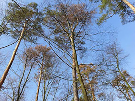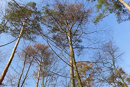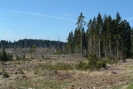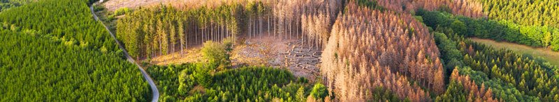 Im Zuge des Klimawandels kommt es aufgrund einer Prädisposition (Krankheitsanfälligkeit) der Bäume sowie des vermehrten Auftretens von Schaderregern bereits zum Ausfall ganzer Bestände (Abb. 1). Bestimmte Baumarten sind sogar im regionalen Maßstab in ihrer Existenz gefährdet. Für manche Waldgebiete bedeutet dies, dass die Forstwirtschaft im klassischen Sinne dort in Frage gestellt werden muss.