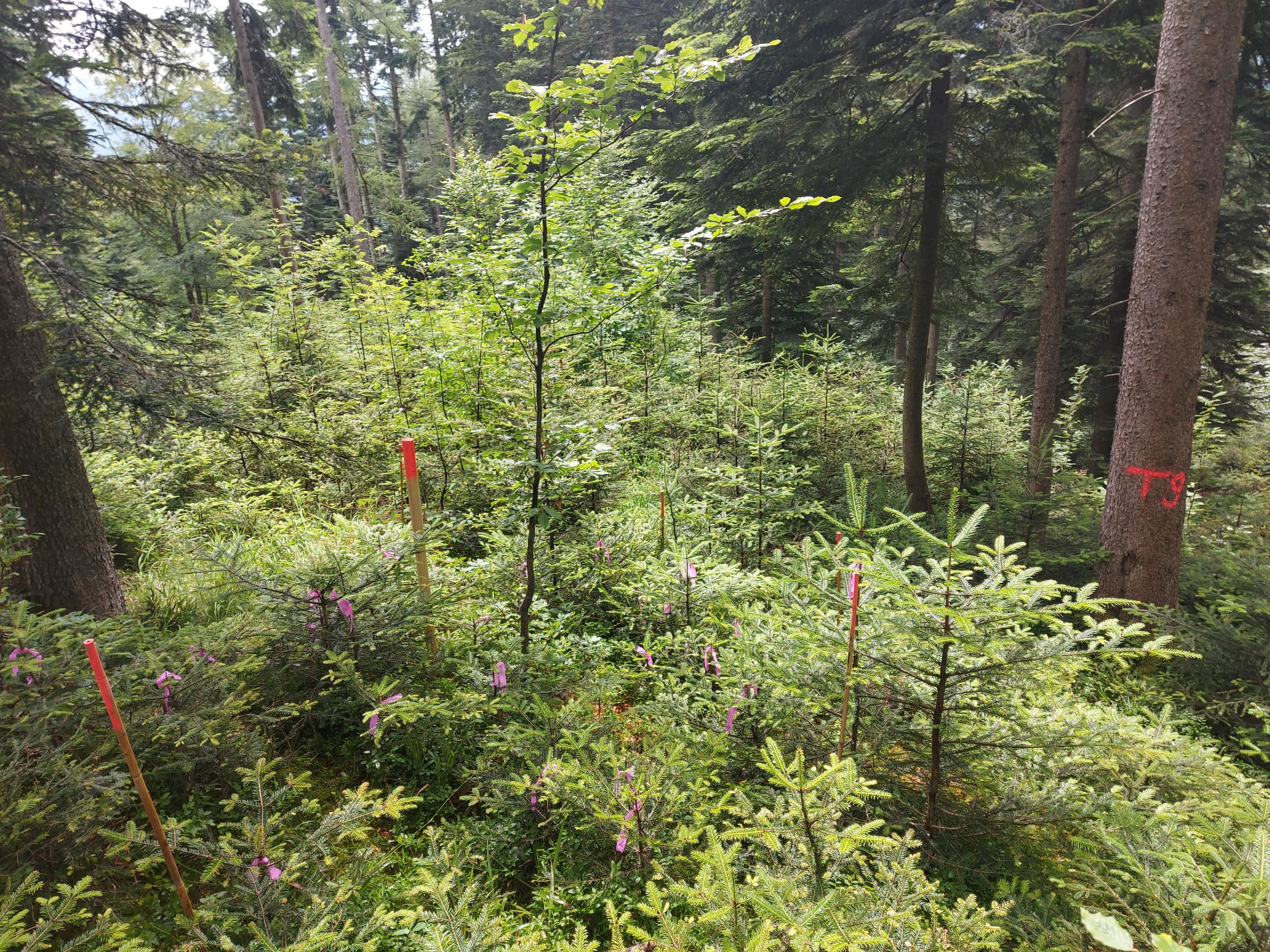 Die Aufnahmen finden jedes Jahr im späten Frühling und im Spätsommer statt. Erfasst werden dabei unter anderem Befallsintensität, Überschirmung, Temperatur, Trieblängen, Knospenzustand und Baummortalität. Abbildung 1 zeigt beispielhaft einen der 30 Aufnahmeplots. Erste Auswertungen sind nach Erreichen der halben Projektlaufzeit für den Winter 2025/2026 geplant.