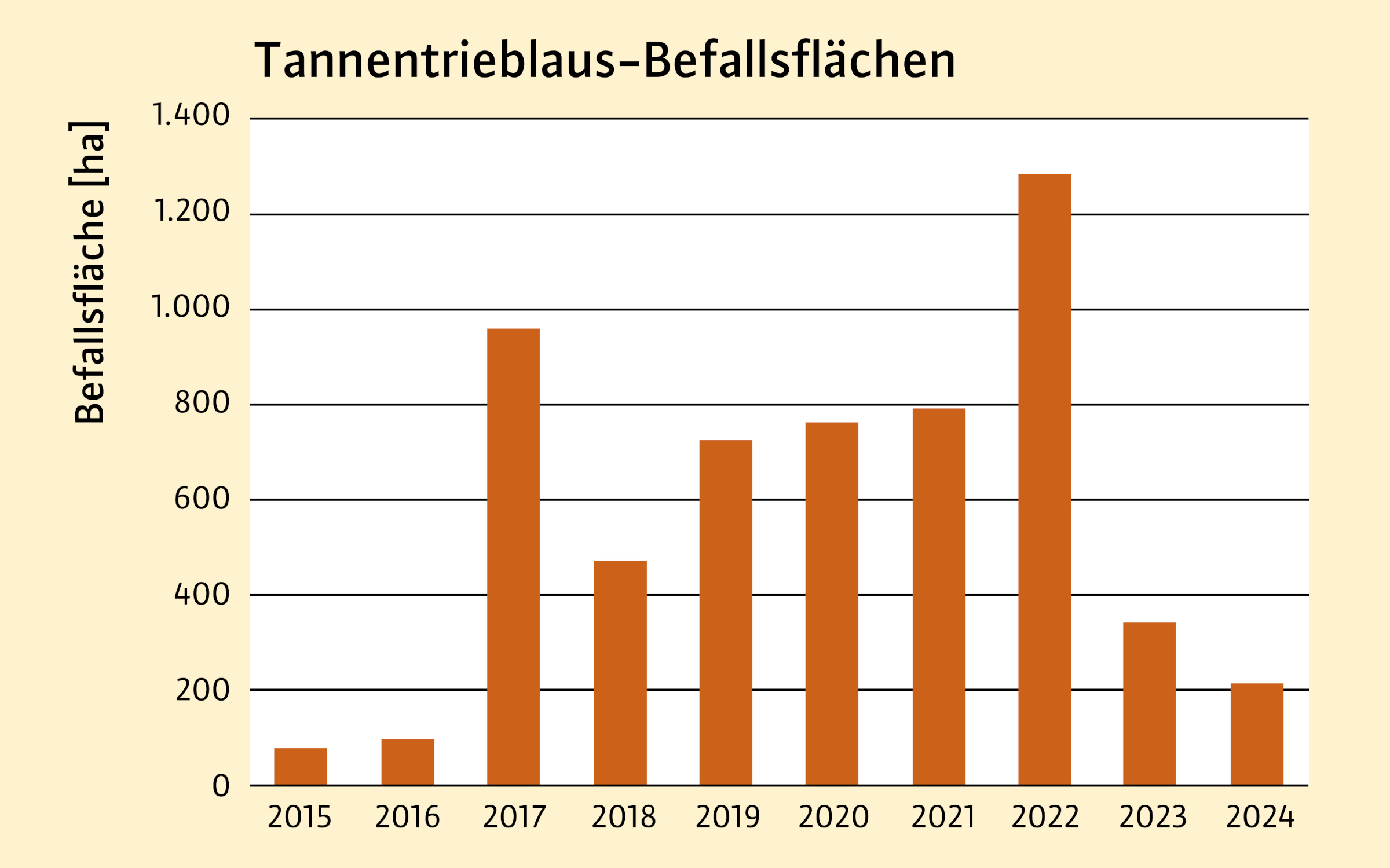 Die Weißtanne spielt eine wichtige Rolle im Waldumbau, ist jedoch v.a. im Bergwald lokal durch die eingeschleppte einbrütige Tannentrieblaus (Dreyfusia (syn. Adelges) nordmannianae) gefährdet. Eine bayernweite LWF-Bonitur gemeldeter Schadflächen bestätigte Befallsschwerpunkte in den Bayerischen Alpen. Das Risiko für einen schweren Befall scheint in höheren Lagen und auf Verjüngungsflächen mit geringer Grundfläche des Altbestandes besonders hoch zu sein. Zugleich haben Beobachtungen von Versuchsflächen in den Jahren 2017 bis 2022 aufgezeigt, dass die Befallsintensität nicht zwingend von Jahr zu Jahr weiter zunimmt. Hingegen wurde beobachtet, dass ein Befall an einzelnen Bäumchen auch rückläufig sein kann. 2023 wurden Beobachtungsflächen mit rund 1.000 Jungtannen in drei BaySF-Gebirgsforstbetrieben eingerichtet, um mögliche Jahreszyklen und die Befallsdynamik zu untersuchen und Ausfallrisiken zu quantifizieren. Bayernweit gesehen ist das Befallsrisiko durch die einbrütige Tannentrieblaus gering. Bei Erstbefall sollten betroffene Tannen im Winter entfernt werden. Eine chemische Bekämpfung wird aktuell nicht empfohlen. Präventiv erscheint eine Mischung mit Laubholz und eine maßvolle Überschirmung ratsam.