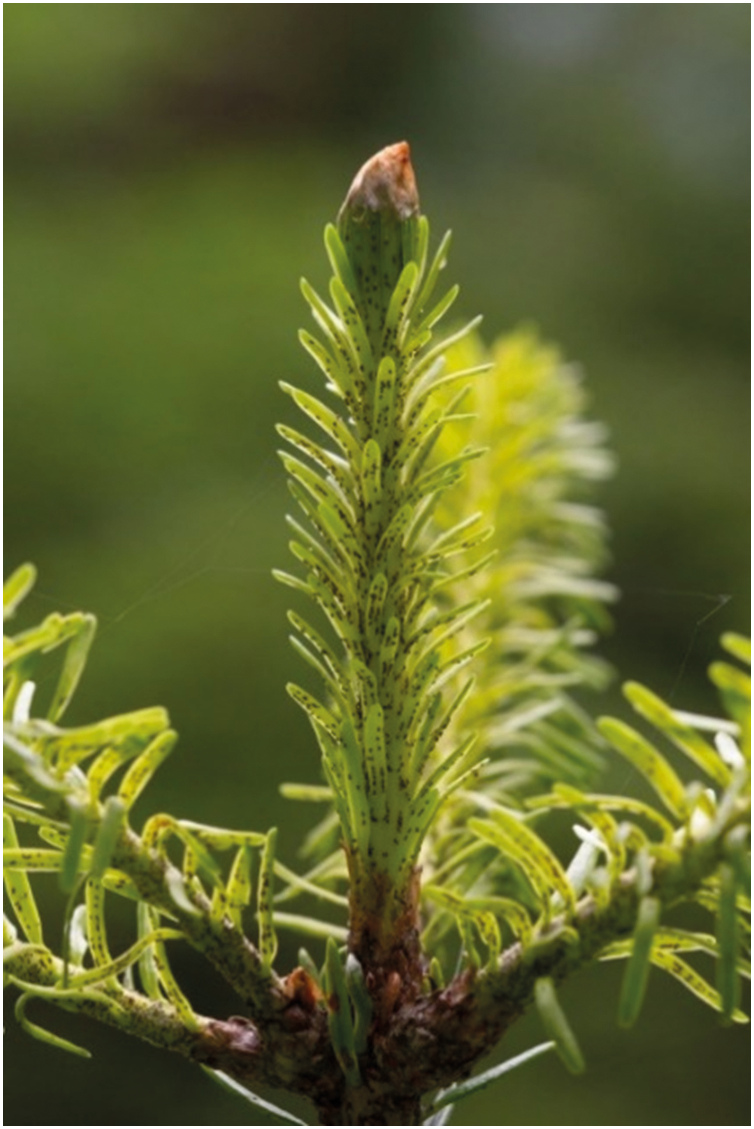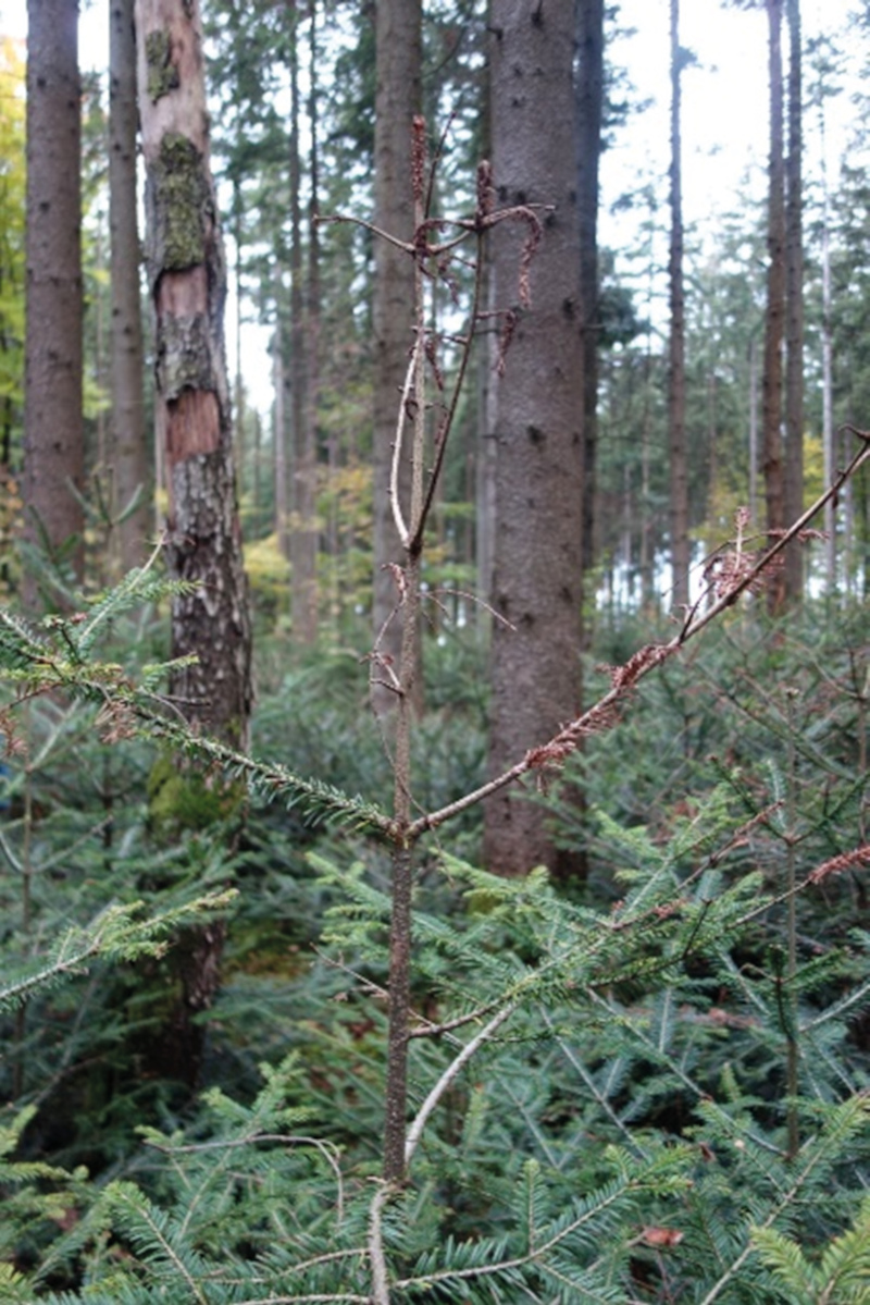 Das Schadbild durch die einbrütige Tannentrieblaus ergibt sich folgendermaßen: Die schwarzen, punktförmigen Tannentrieblaus-Larven sind stecknadelkopfgroß und saugen an den frischen Nadeln des diesjährigen Maitriebs (Mai bis Juni) sowie an den Trieben (Sommer) überwiegend im oberen Kronendrittel von Jungtannen (Abbildung 4a). Dies führt häufig zu kurzen, vergilbten Nadeln. Eine typische Folge starken Befalls sind nach unten gekrümmte Nadeln. Die unterseitigen Wachsstreifen sind nicht mehr sichtbar, wodurch häufig das Bild einer “Flaschenbürste” entsteht (Abbildung 4b). Die verkümmerten Triebe sterben in der Folge meist von oben her ab (Wipfeldürre; Abbildung 5). Bei mehrjähriger Besiedelung kann es zum Absterben von Jungtannen kommen, was sich dann oft einzelstammweise- bis truppweise vollzieht. Dies verursacht eine Reduktion des Tannenanteils in der Verjüngung, wenn auch bei ausreichender Überschirmung meist kein Totalausfall eintritt. In der Literatur wird auch ohne Angabe quantitativer Details von Schäden berichtet, die fast zur vollständigen Vernichtung von Tannenverjüngungen führten. Nach Beobachtungen der LWF liegt die gefährdete Höhe der jungen Bäume meist zwischen ein bis sieben Metern, seltener bis zu zehn Metern.
