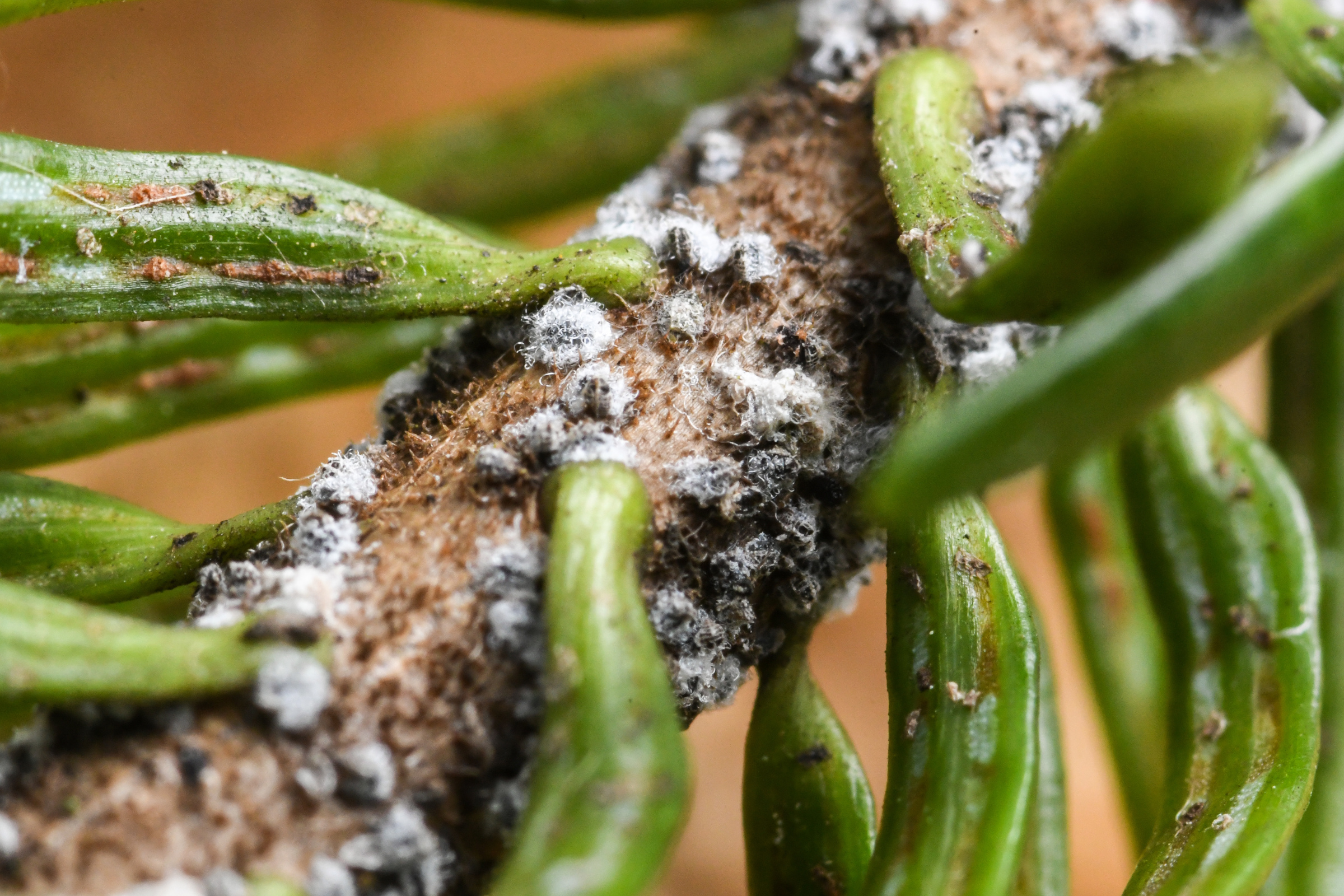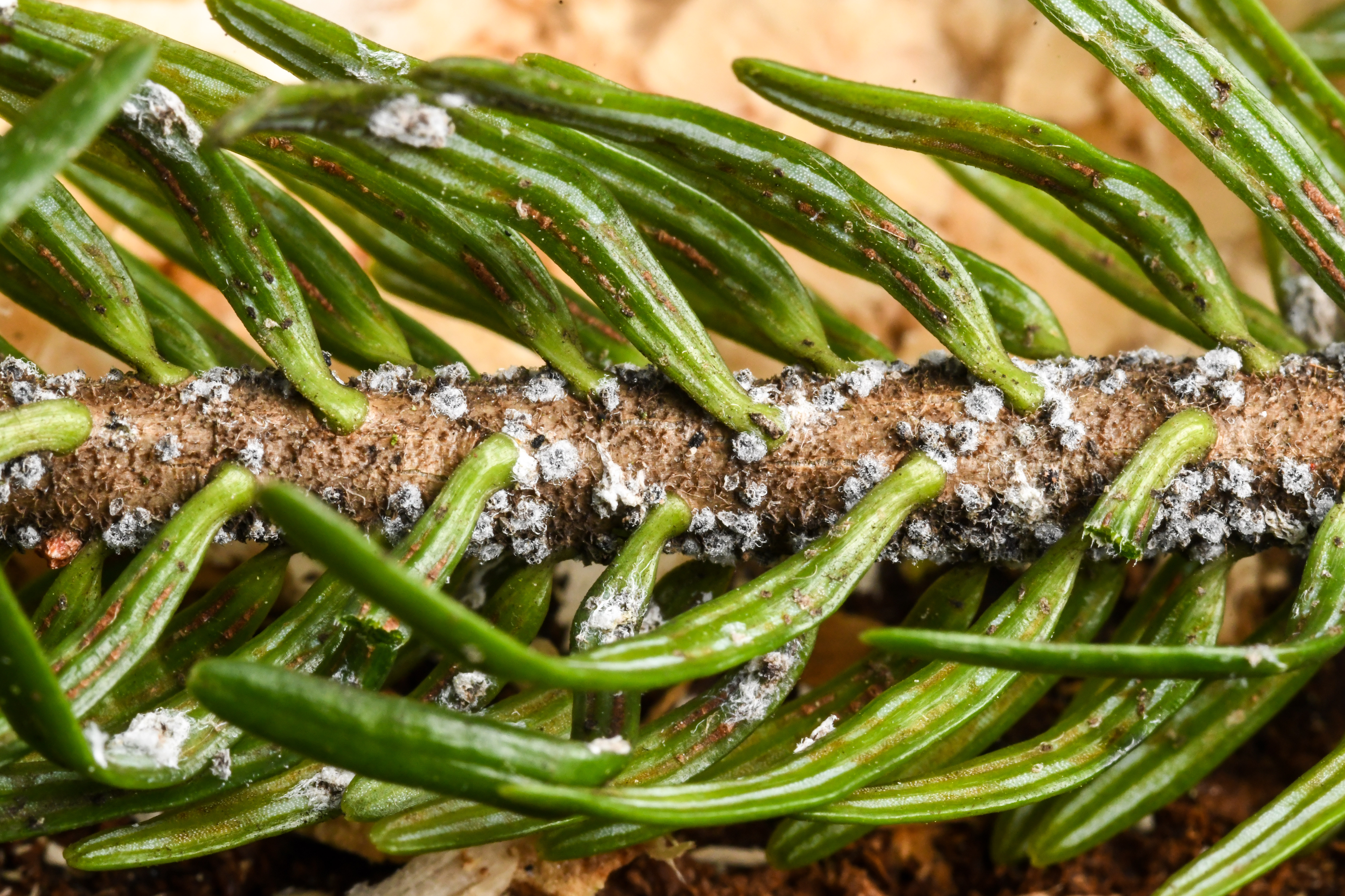 Die Saugtätigkeit am Stamm beeinträchtigt die Vitalität der Tanne nicht direkt. Die TTL überwintert dort in schützenden Wachswollhäufchen an Nadeln, Trieben und Stämmchen (Abbildung 3). Die Ausbreitung erfolgt passiv über den Wind und über eine Verschleppung durch Tiere oder Menschen.