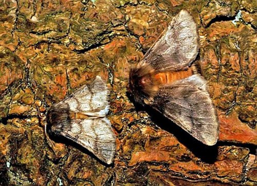 Abb. 2: Eichenprozessionsspinner (Thaumetopoea processionea), männlich (links), weiblich (rechts). Foto: Orchi, Wikimedia Commons