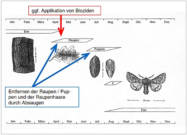 Beim Absaugen der Nester werden erfahrungsgemäß nicht alle gefunden. Insofern sind im Frühjahr 2019 Biozideinsätze in besonderen Bereichen ins Auge zu fassen. Die Einsatzbereiche sollten ggf. durch Eigelegesuchen in den Eichenoberkronen (ab Oktober) verifiziert werden.