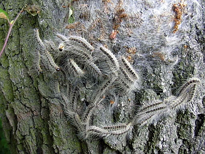 Abb. 6: Altraupen in einem Nest an einem Eichenstamm. Foto: M. Wießner