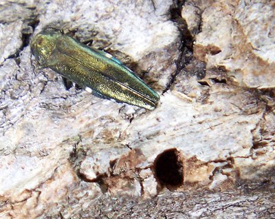 Als wärmeliebendes Insekt, das geschwächte Eichen befällt, findet der Zweipunkt-Eichenprachtkäfer (Abb. 3) auf der Fränkischen Platte aktuell ideale Lebensbedingungen vor. Gefährlich sind die Larven, die mit ihrem Fraß zwischen Splintholz und Rinde den Saftstrom unterbrechen können. Die Larven verpuppen sich in der dicken Eichenrinde zu fertigen Käfern. Deshalb ist es ausgesprochen wichtig, das eingeschlagene Holz mit der Rinde rechtzeitig aus dem Wald abzufahren. Rechtzeitig bedeutet vor der nächsten Flugperiode, die witterungsabhängig ab Mitte April beginnen kann. Wie bei den Fichtenborkenkäfern ist zur Eindämmung dieser Art eine "saubere Waldwirtschaft" unumgänglich. Der Eichenprachtkäfer durchläuft pro Jahr nur eine Generation und ist daher grundsätzlich leichter zu bekämpfen als die Fichtenborkenkäfer.