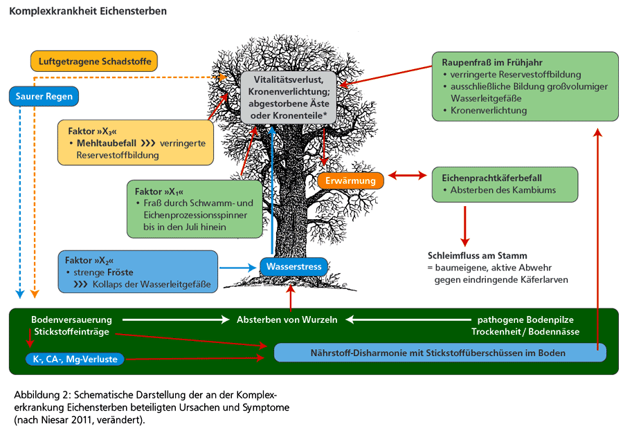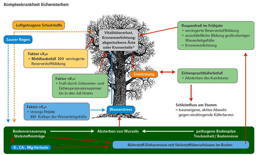 Treffen die beiden Faktorengruppen zusammen, kann es zu einem spontanen insekteninduzierten Eichensterben kommen. Ist die Eiche einmal geschädigt, können sekundäre Einflussfaktoren den Fortlauf der Schädigung beschleunigen. Zu diesen sekundären Faktoren gehören der Zweipunkt-Eichenprachtkäfer (Agrilus biguttatus) und der Hallimasch (Armillaria ssp.).