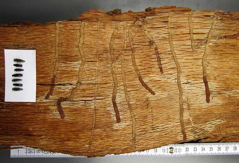 Wie in Abbildung 4 zu sehen ist, können aus einem kleinen Rindenstück von der Größe eines DIN-A4-Blattes bis zu sieben Eichenprachtkäfer schlüpfen. Wichtige Forstschutzmaßnahmen sind daher die Aufarbeitung der betroffenen Bäume einschließlich des Kronenholzes und die konsequente Abfuhr von Stamm- und Brennholz.
